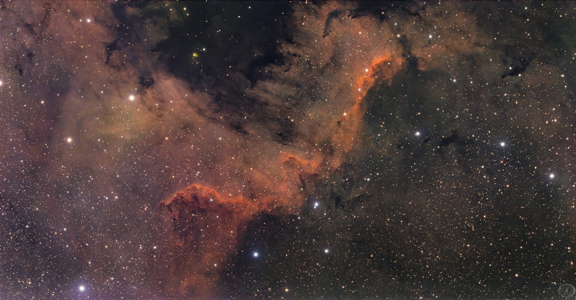 NGC7000 oder auch Nordamerikanebel ist ein großer Emissionsnebel, der eine gewisse Ähnlichkeit mit dem Kontinent Nordamerika aufweist. Im Bild ist ein Teil des Gebietes zu sehen, des sog. Cygnus Walls (entsprechend „Mexiko“).