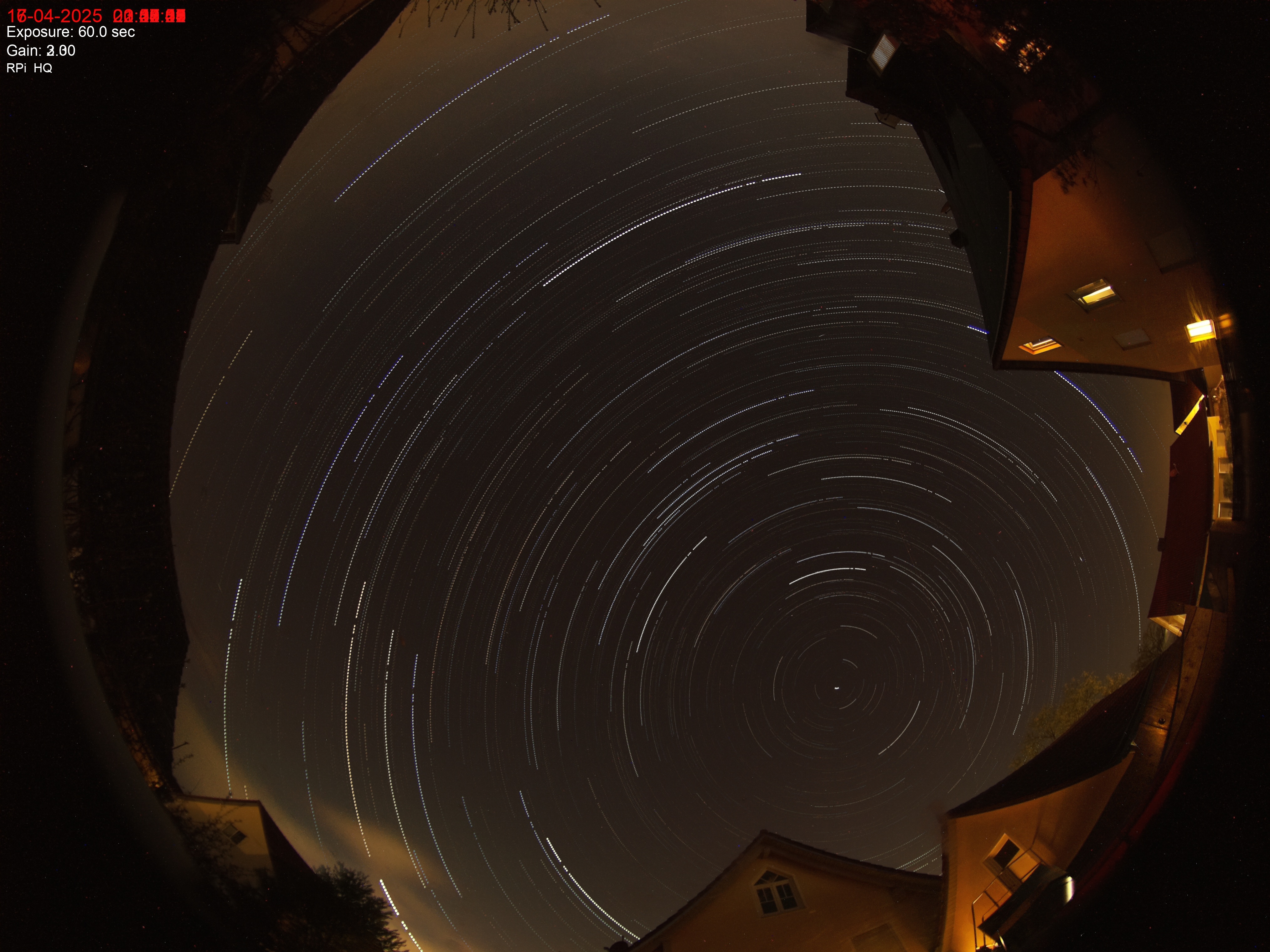 Die Allskykamera ist ein Eigenbau und besteht im wesentlichen aus einem RaspberryPi5 einer HQ Kamera und einem Fischaugenobjektiv für 360 Grad Rundumsicht. Sie zeigt immer das aktuelle Wetter über der Sternwarte, Tag und Nacht. Die Bilder der Nacht werden 5 Tage gespeichert, so kann die Nacht immer analysiert werden wie klar sie gewesen ist und ob Wolken durchgezogen sind.