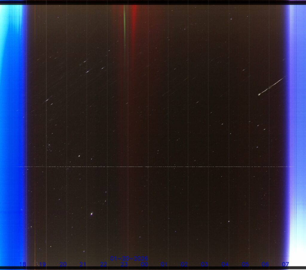 Das Keogramm gibt Auskunft über die Bewölkung und sonstige Himmelsereignisse. Hier ist die Aurora Borealis vom 19.01.2026 dokumentiert.