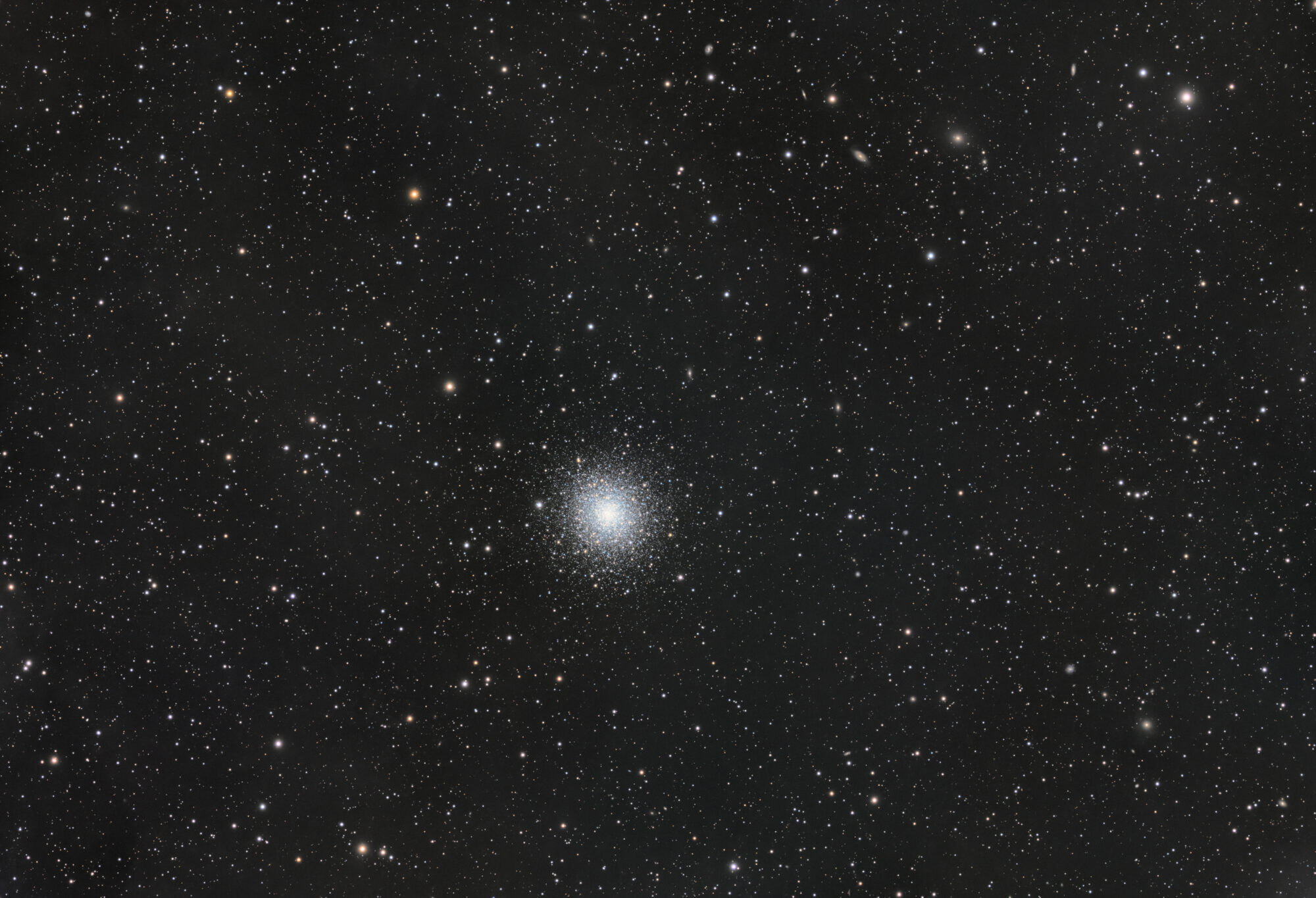 M92 ist nur wenig kleiner und schwächer wie der bekanntere Herkules Kugelsternhaufen M13. M92 ist etwas kompakter und ungefähr gleich alt wie M13. Auch liegt er nicht all zu weit von M13 entfernt und findet deswegen wohl weniger Beachtung. M92 besitzt 16 veränderliche Sterne, davon 14 RR Lyrae. Seine Entfernung beträgt ca. 26.000 Lichtjahre. Im Hintergrund sind einige kleinere Galaxien zu entdecken. Da zum Aufnahmezeitpunkt auch Saharastaub in der Luft war und Vollmondbedingungen herrschten, ist nicht ganz auszuschließen das auch dieser sich im Bild abzeichnet. Galaktischer Zirrus ist normalerweise unter Vollmondbedingungen kaum nachweisbar.