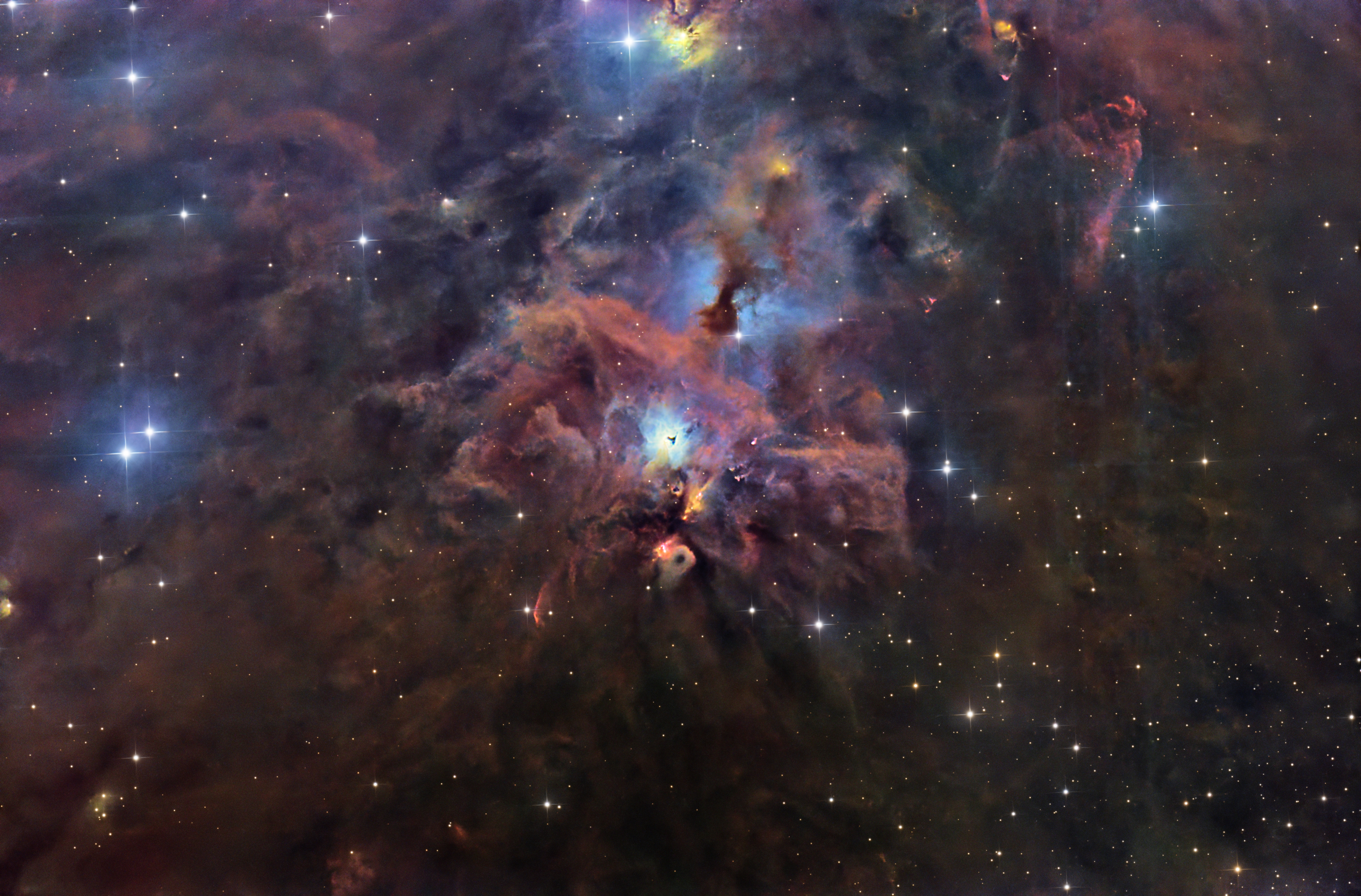 NGC1999 wird auch als Schlüsselloch Nebel bezeichnet. Seinen Namen hat er durch die Dunkle Struktur im Kern des blauen Bereichs im Bildzentrum. Dieser Dunkelbereich ist einfach ein Loch im Nebelgebiet, welches die umliegenden Sterne sozusagen freigelegt haben. Man blickt auf den dahinterliegenden Weltraum. Es sind auch Herbig Haro Objekte im Bild, also ganz junge Sterne die sich eben erst gebildet haben und ihre Geburtsstätte rot illuminieren (HH1 und HH2). Da in der Gegend sehr viele Satelliten kreisen haben es ein paar Spuren rechts auch ins Bild geschafft. Hier kommen selbst die besten Algorithmen von PixInsight (Stacking und Bildbearbeitungsprogramm) an ihre Grenzen.
