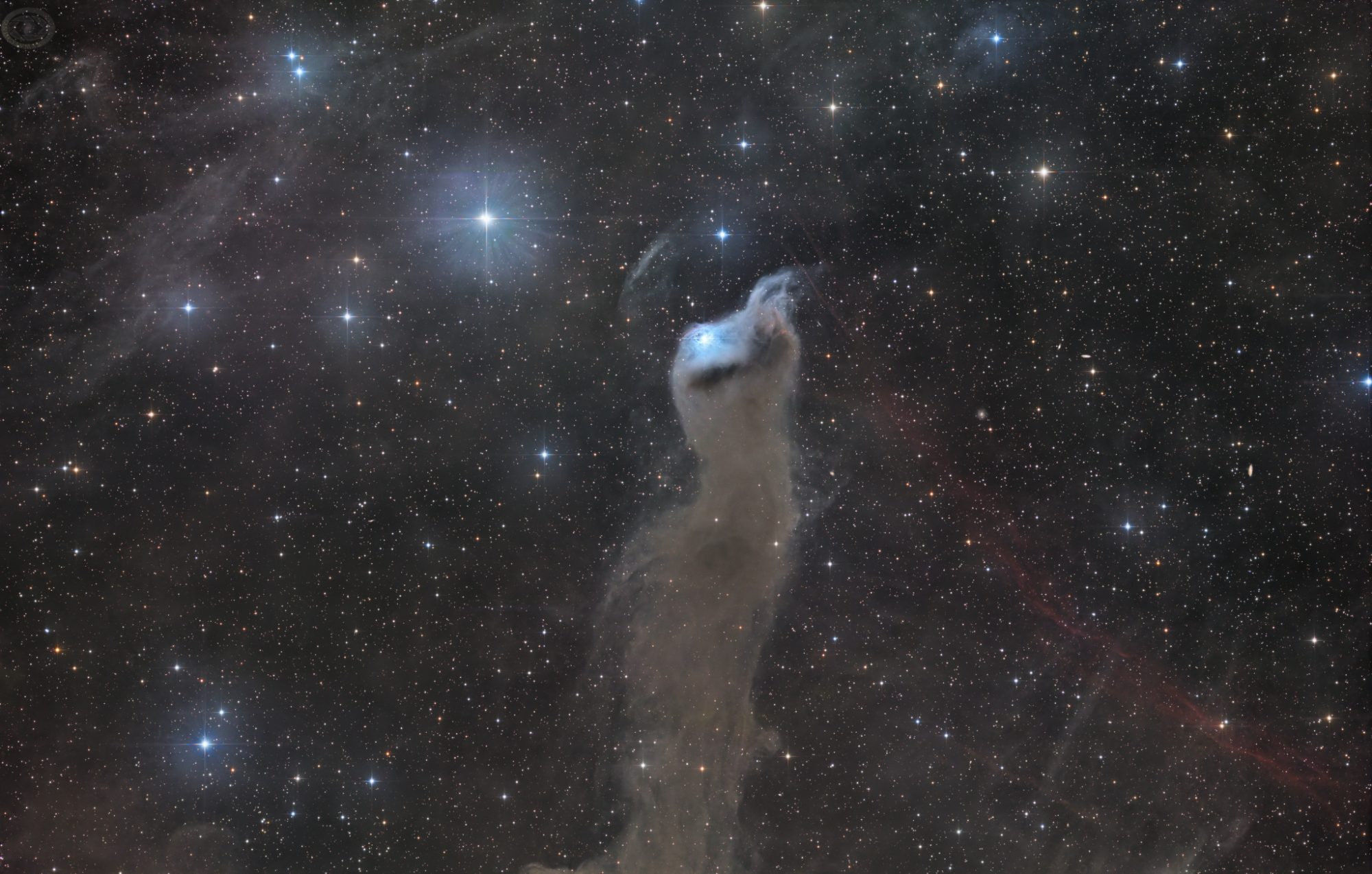 VdB152 ist an der Spitze eines Dunkelnebels der auch Wolf´s Cave Nebel genannt wird. Ein Streifen ionisiertes Gas (Halpha) ist rechts dennoch zu sehen