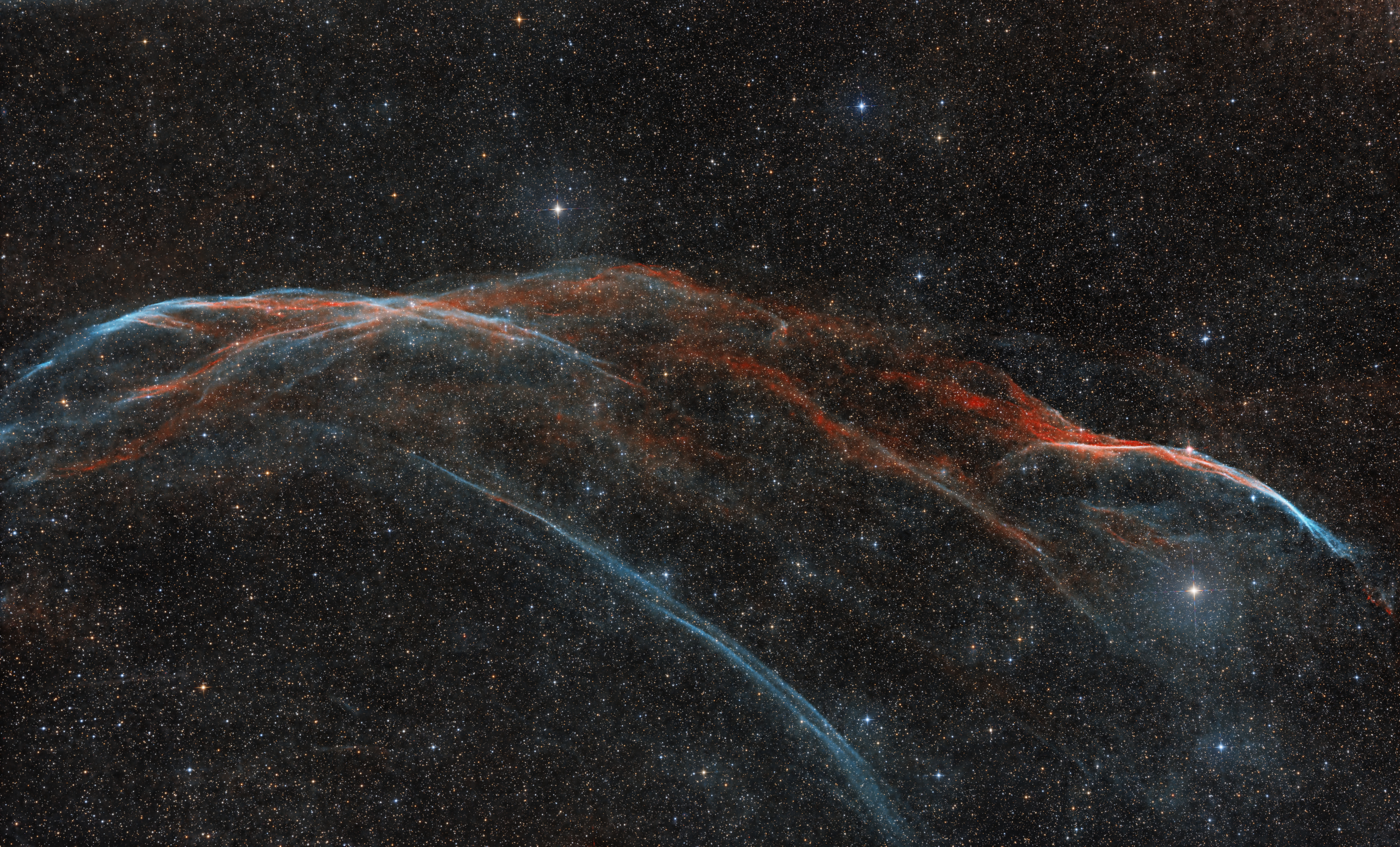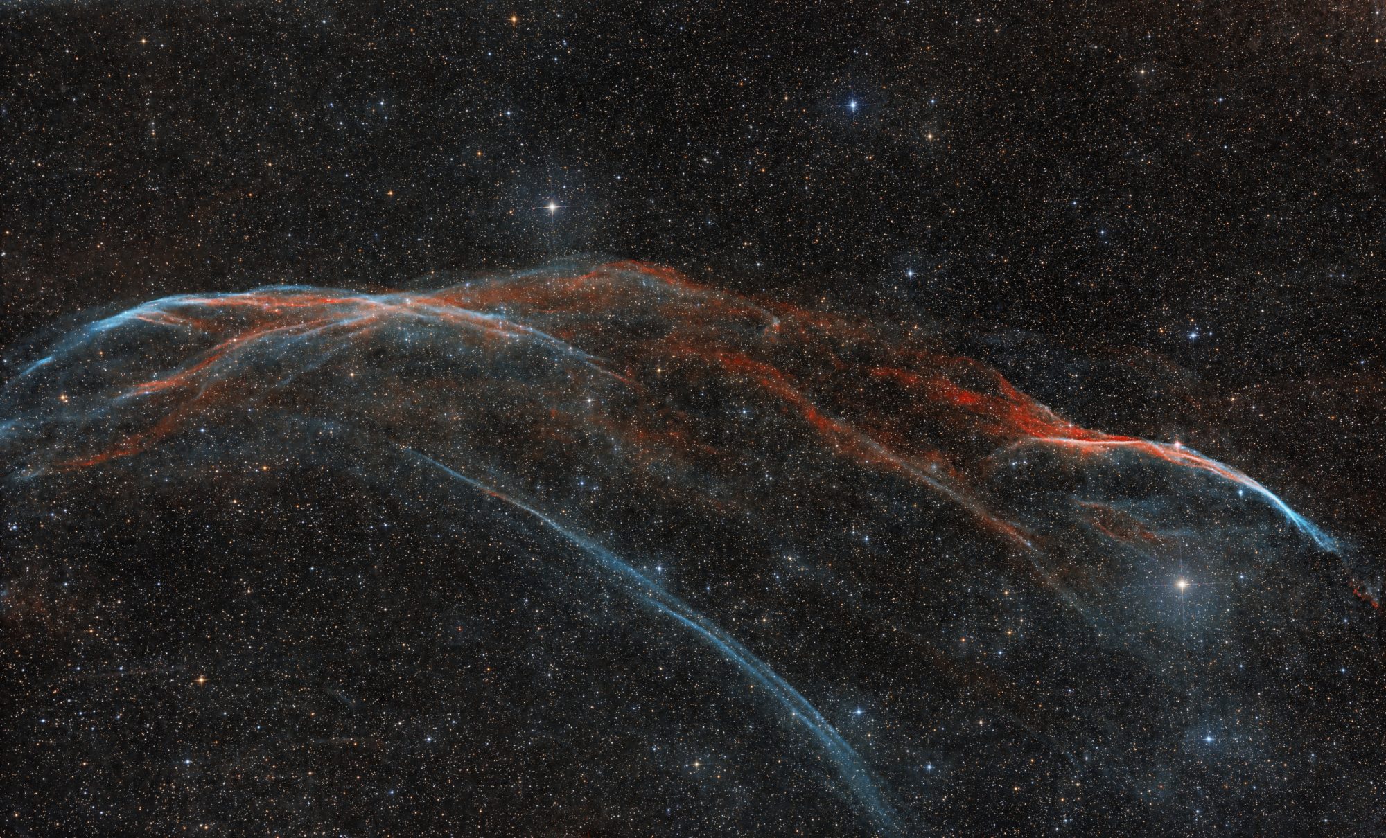 SH2-91 ist ein Teil einer riesgen „Superblase“. Diese SN liegt bereits 30.000 Jahre zurück und ist daher schon sehr lichtschwach und weit im Raum verstreut. Ein sehr schwierig zu fotografierendes Objekt.